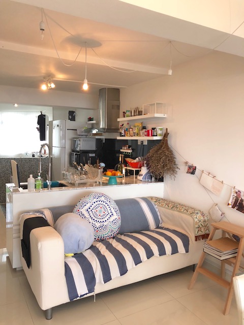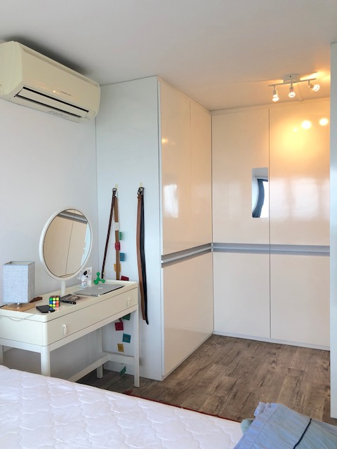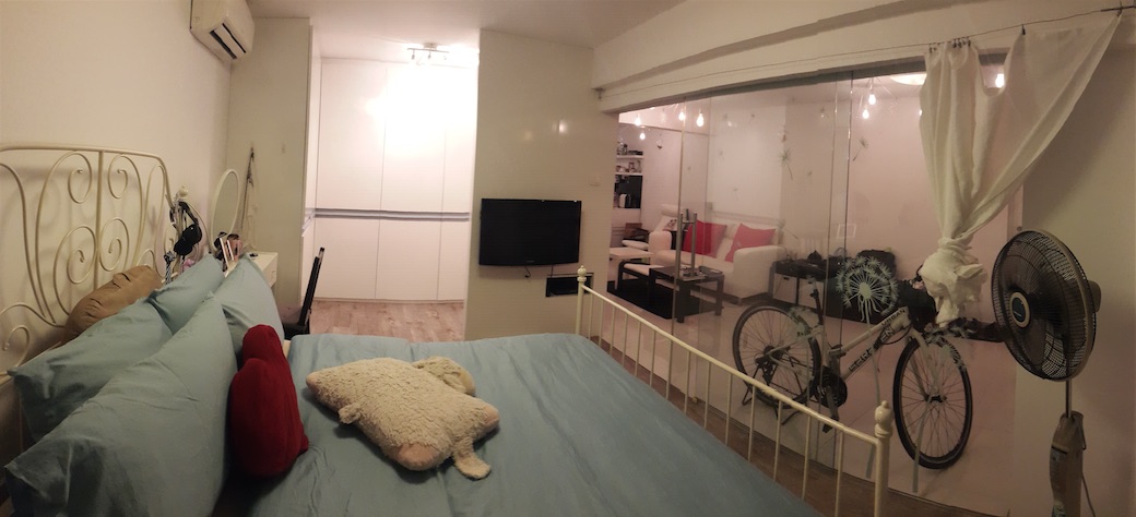 It’s a complete revamp. Neat, light and bright. Walls were knocked down to create a spacious one bedroom flat. The sliding glass door and panel divide the living /entertainment space from the bedroom whilst keeping the openness of it. The open plan allows natural light to flow through and illuminates the space.