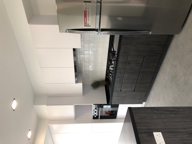Kitchen in 2 tones – the classic subway tile backsplash and neat white cabinetry juxtaposed with the dark wood-like textured cabinets and island. It is modern and clean-lined. Well-equipped with a 3-burner stove, range hood, and an oven. Definitely one great for hosting dinner parties.