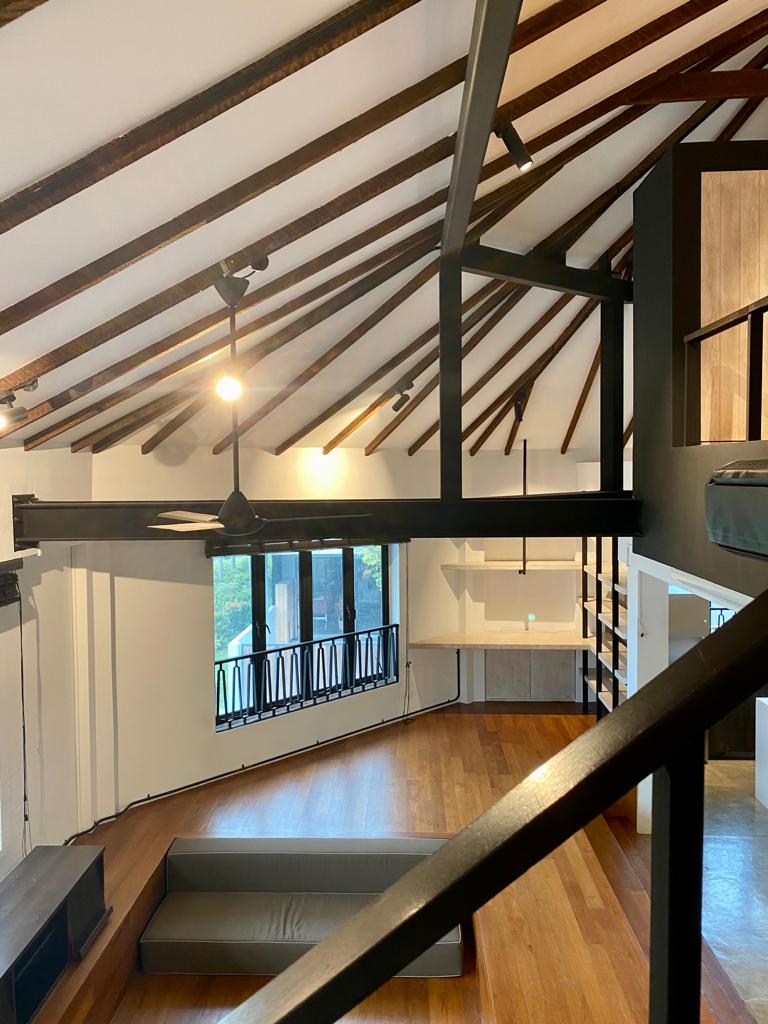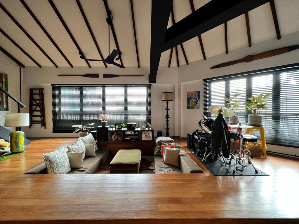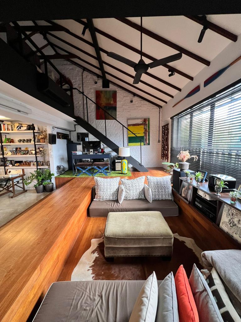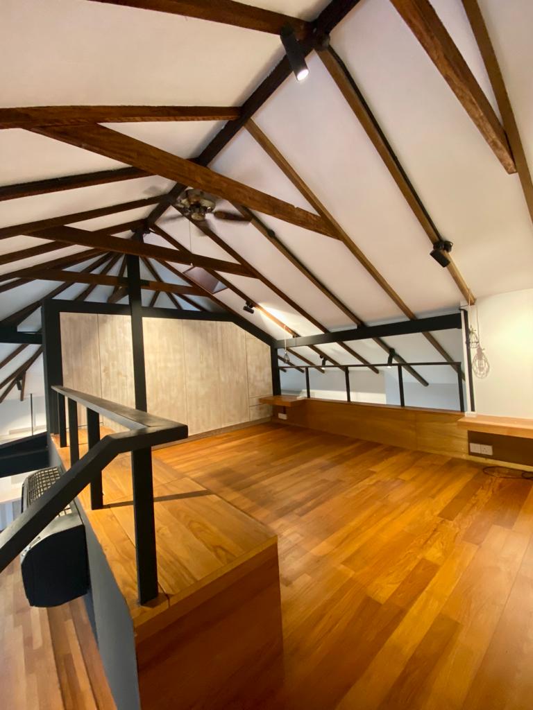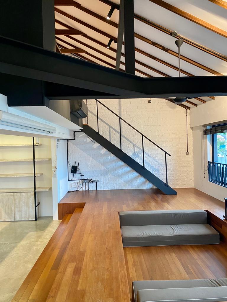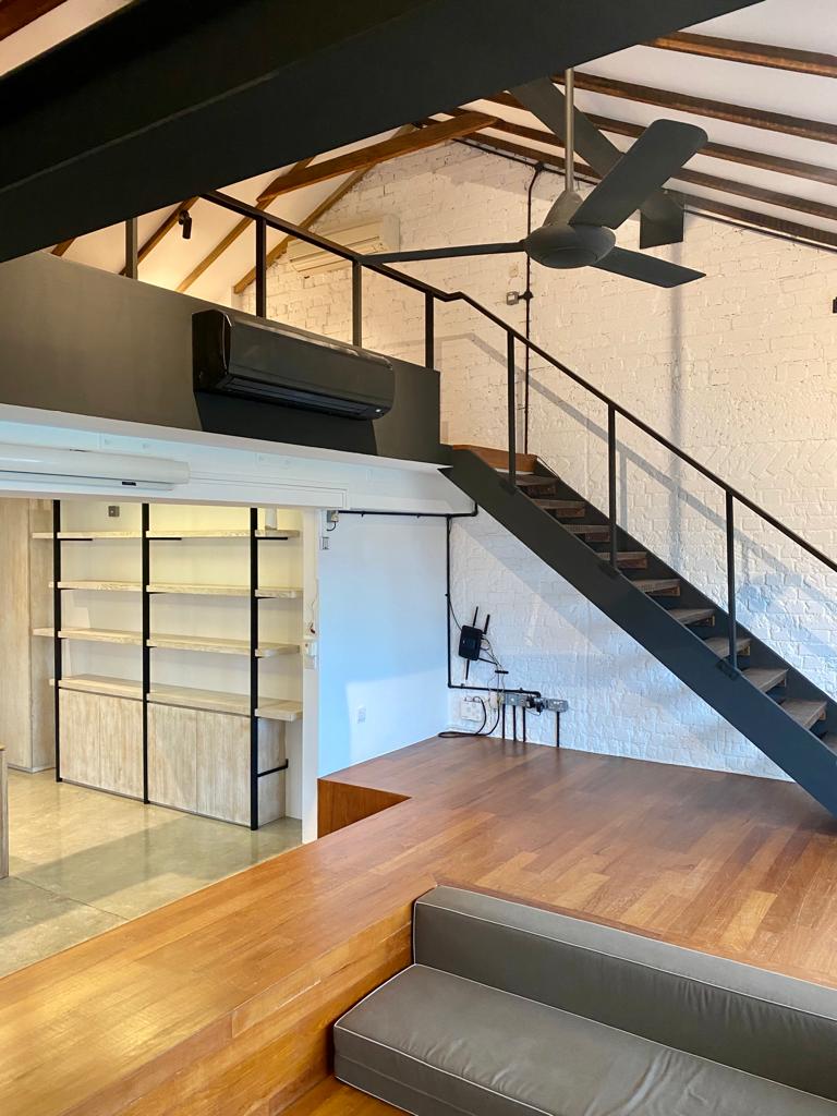 Approximately 1000 sqft of interior space, the spacious apartment has a living, dining and, an open kitchen fully equipped with a hob, hood and oven. There’s even a good size island which serves as a breakfast counter! The roomy living area sits next to the windows and is made cosy with the design of a raised timber platform with the stairs leading to the mezzanine tucked neatly at a corner. The apartment is illuminated with natural light from the vast windows creating a bright open living environment. The ambience can be easily adjusted with the use of the venetian blinds installed.