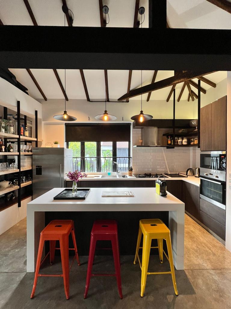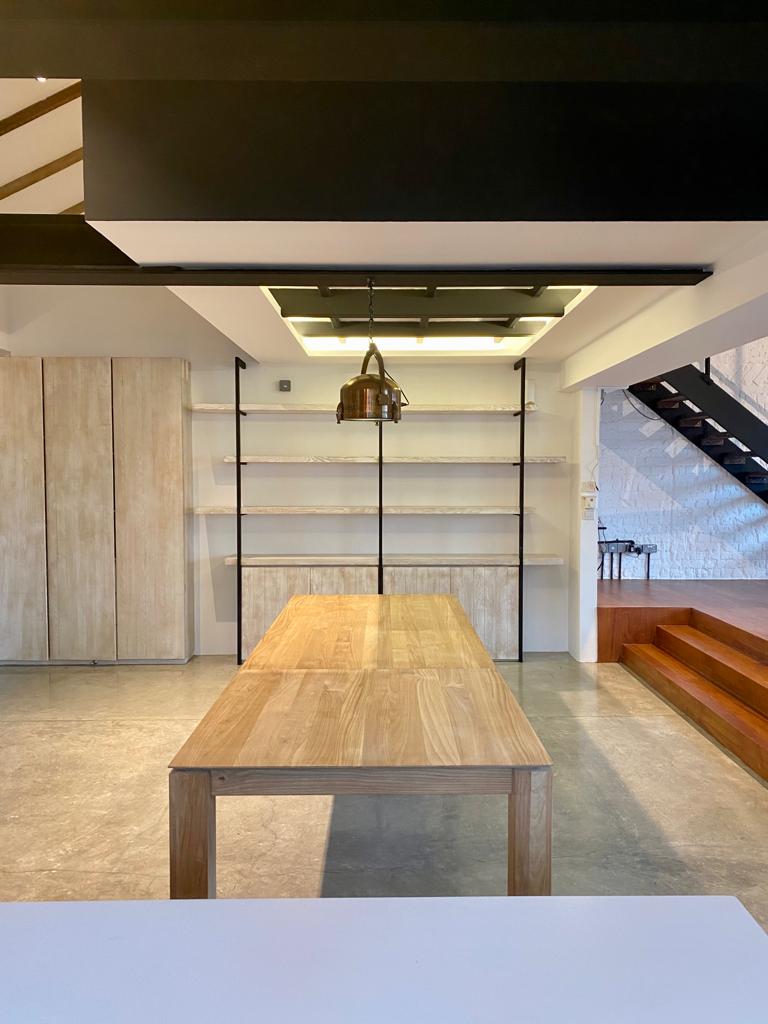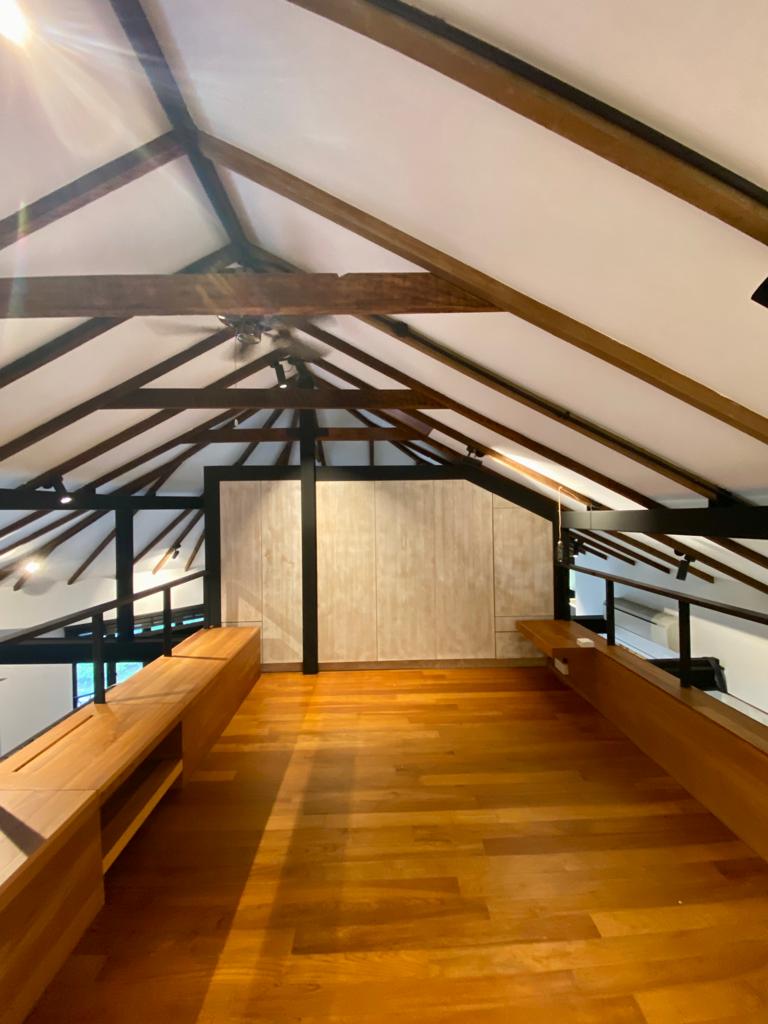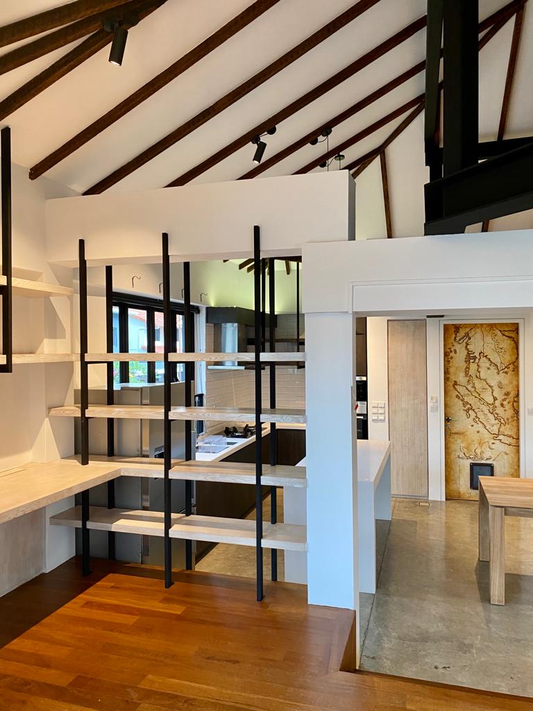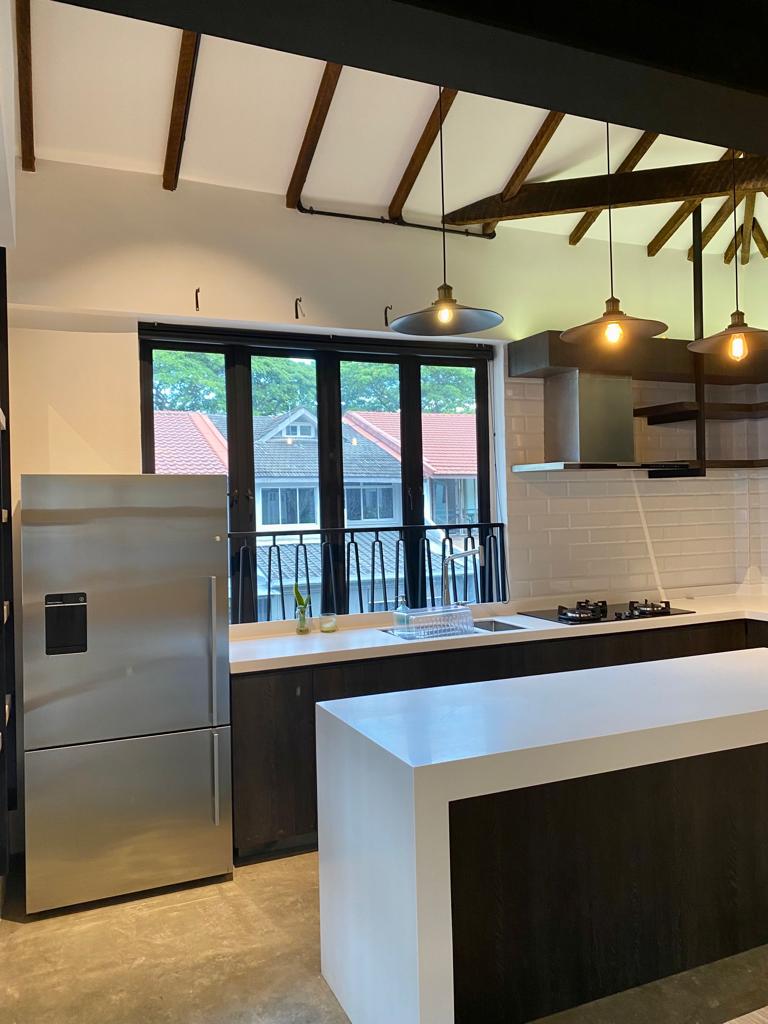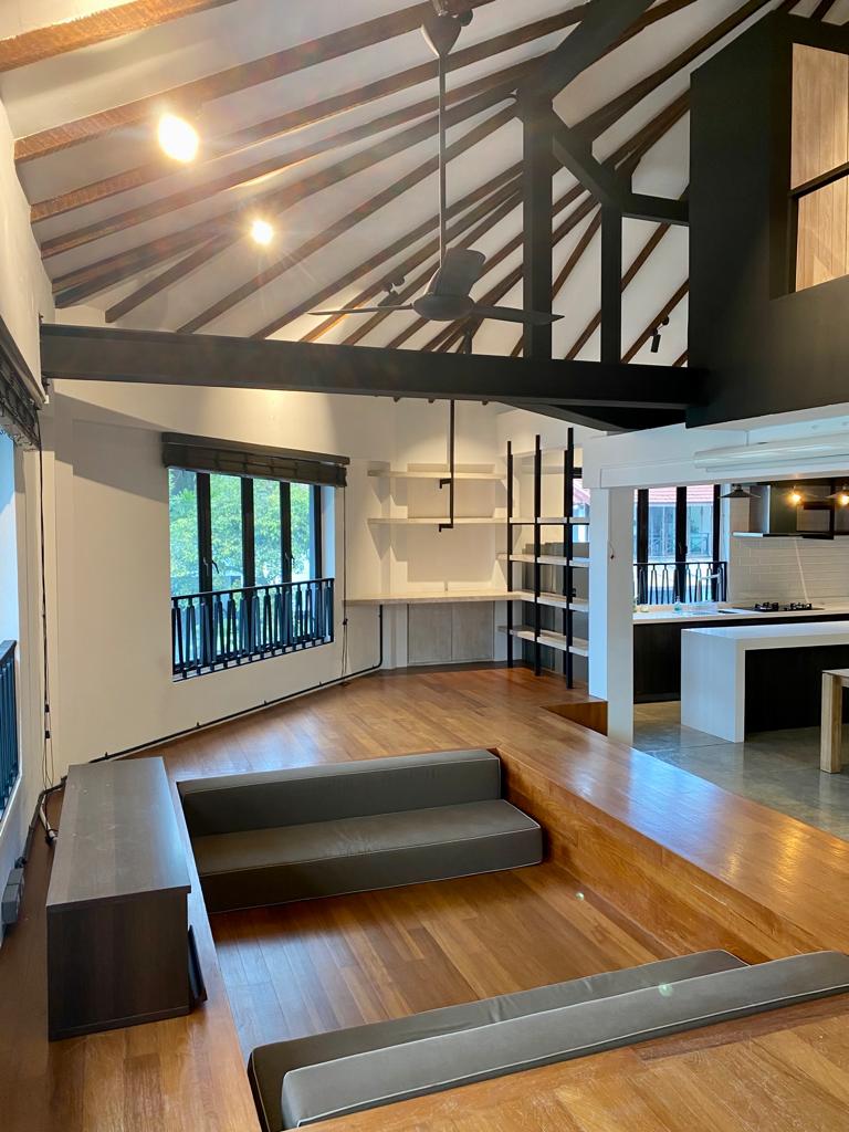Approximately 1000 sqft of interior space, the spacious apartment has a living, dining and, an open kitchen fully equipped with a hob, hood and oven. There’s even a good size island which serves as a breakfast counter! The roomy living area sits next to the windows and is made cosy with the design of a raised timber platform with the stairs leading to the mezzanine tucked neatly at a corner. The apartment is illuminated with natural light from the vast windows creating a bright open living environment. The ambience can be easily adjusted with the use of the venetian blinds installed.