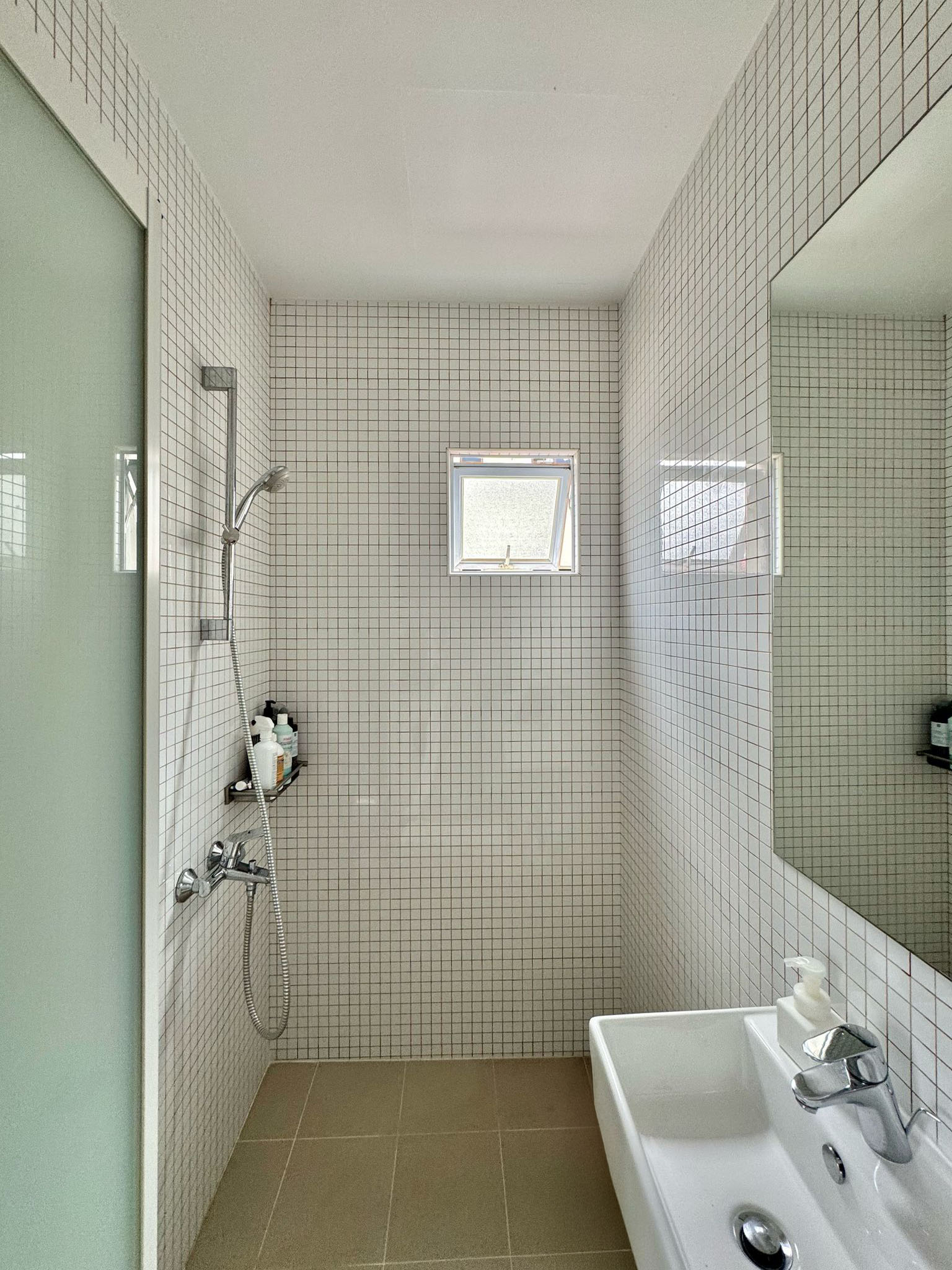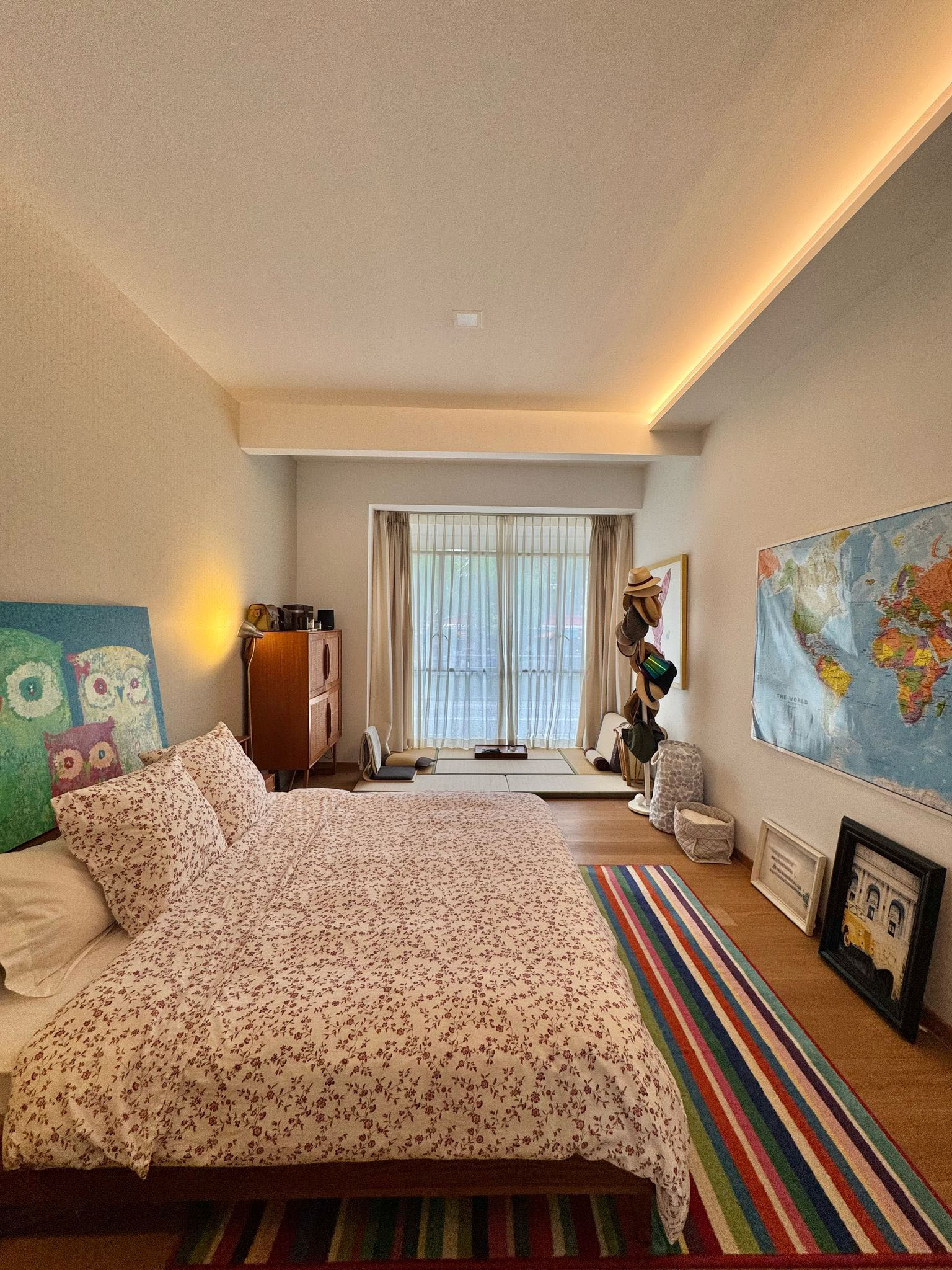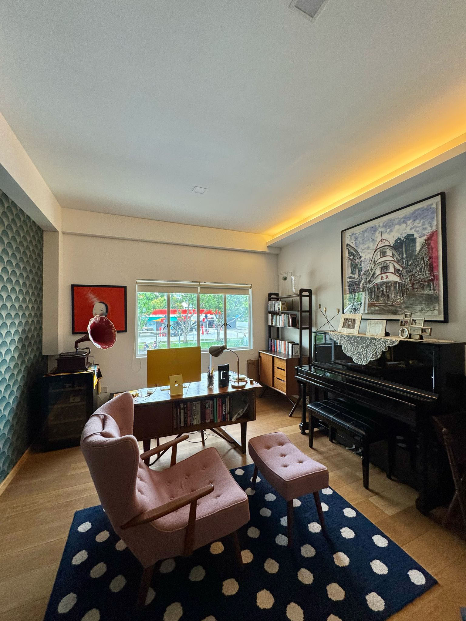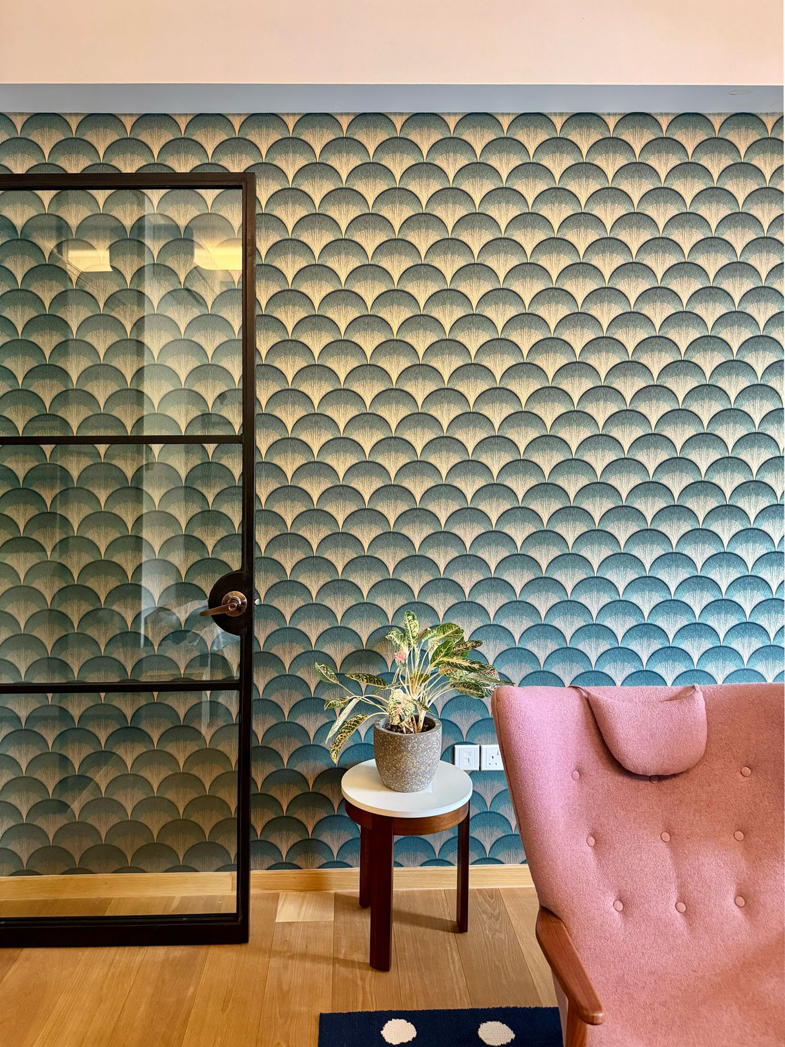 The master bedroom is a private retreat, complete with a walk-in wardrobe and an attached bathroom. Both bedrooms feature intricately designed wallpapers, adding character and a refined touch to the space. The second bedroom, now set up as a study, is bathed in natural light, making it an inspiring workspace that can easily be transformed into a bedroom.