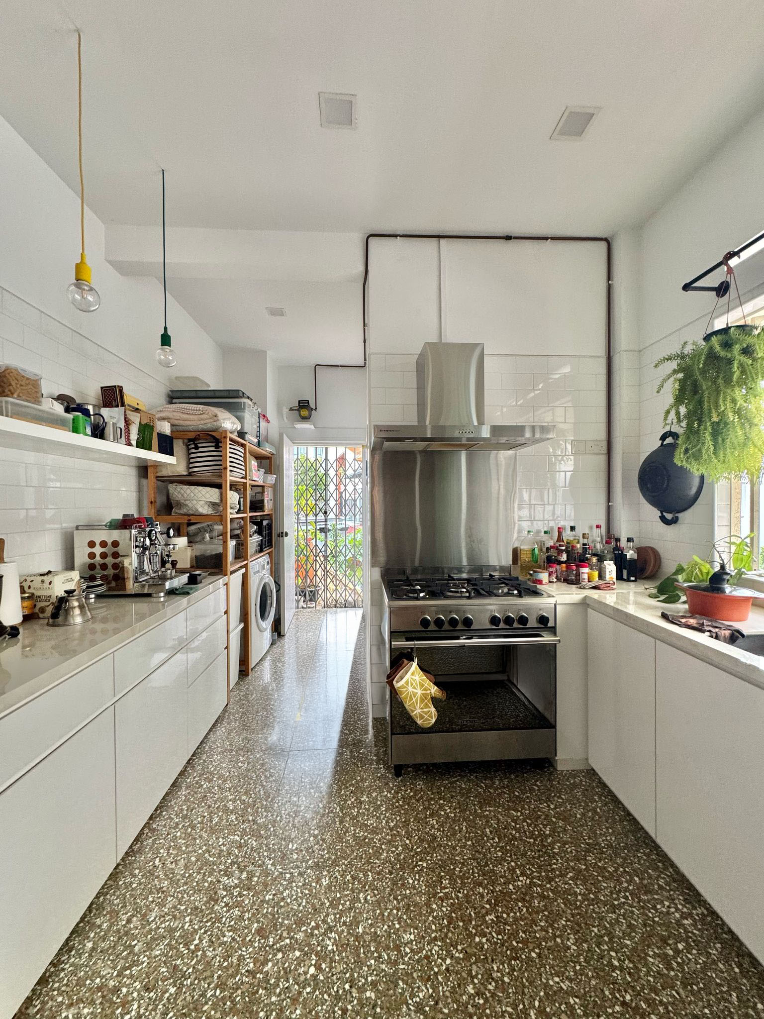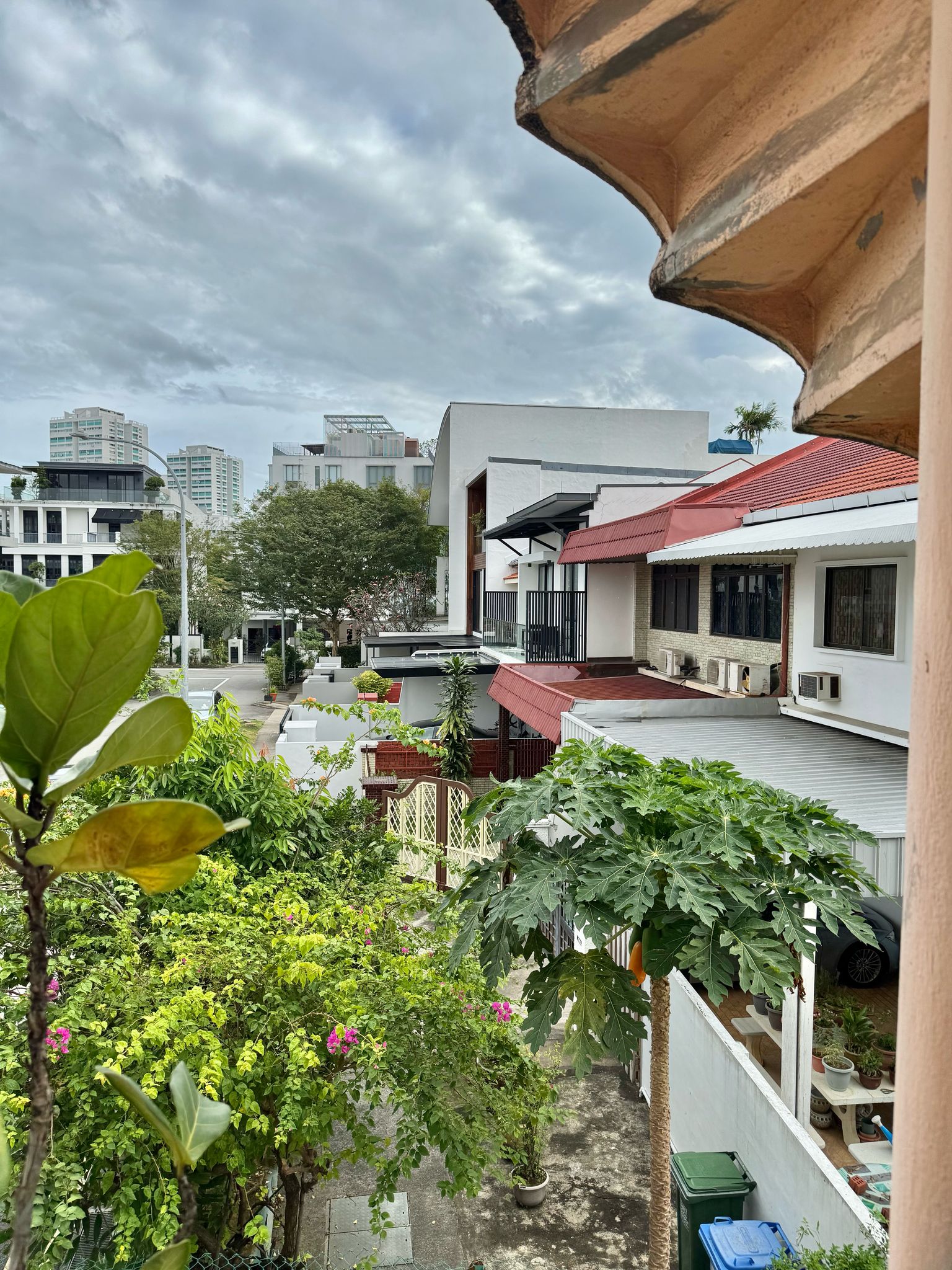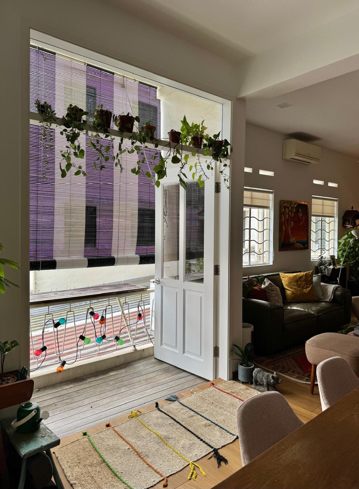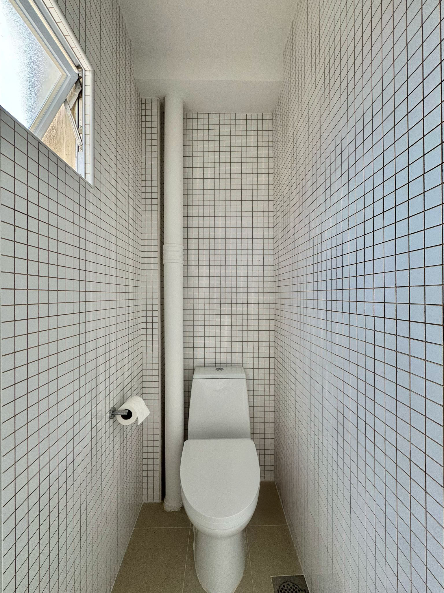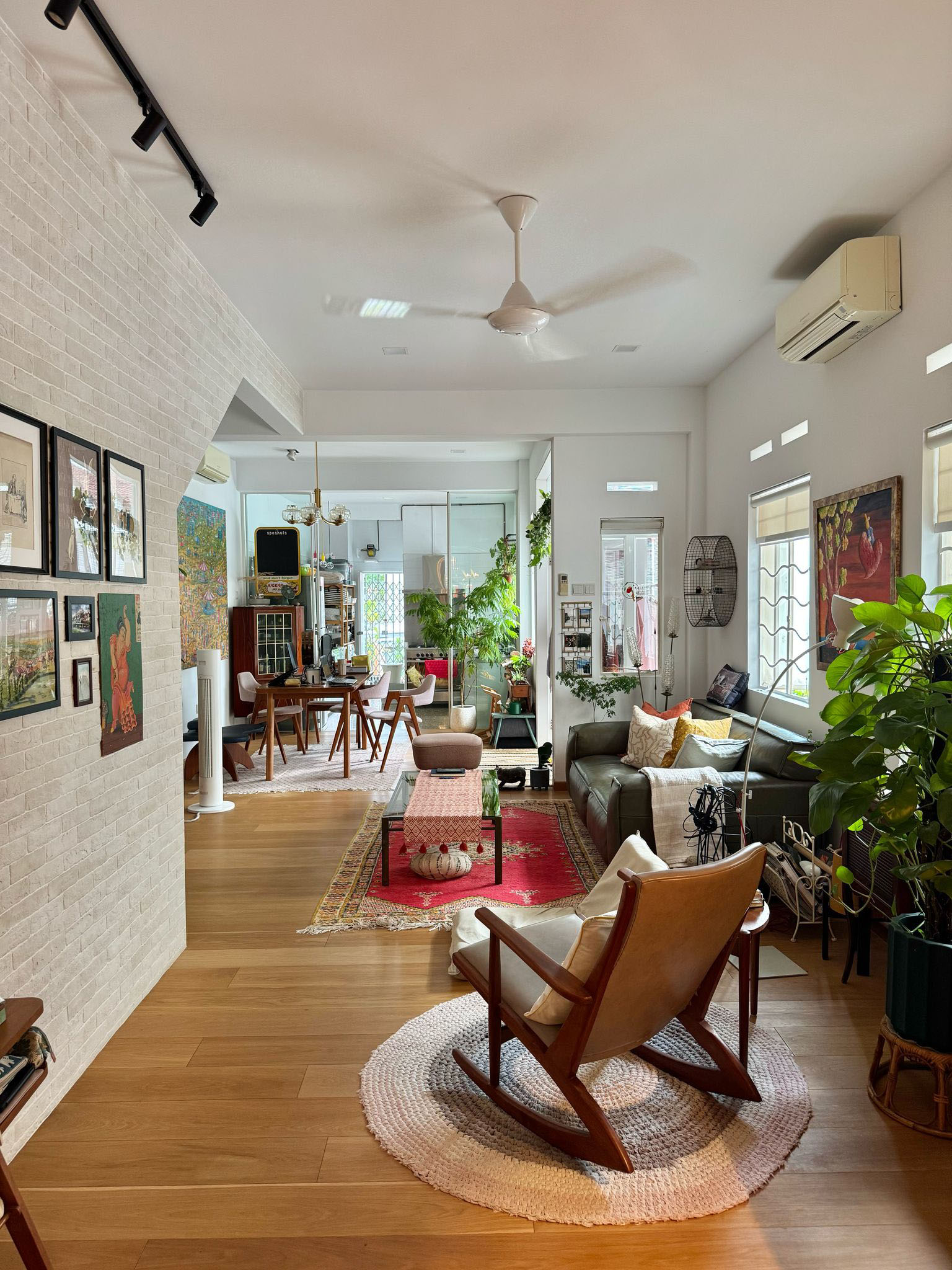 The master bedroom is a private retreat, complete with a walk-in wardrobe and an attached bathroom. Both bedrooms feature intricately designed wallpapers, adding character and a refined touch to the space. The second bedroom, now set up as a study, is bathed in natural light, making it an inspiring workspace that can easily be transformed into a bedroom.