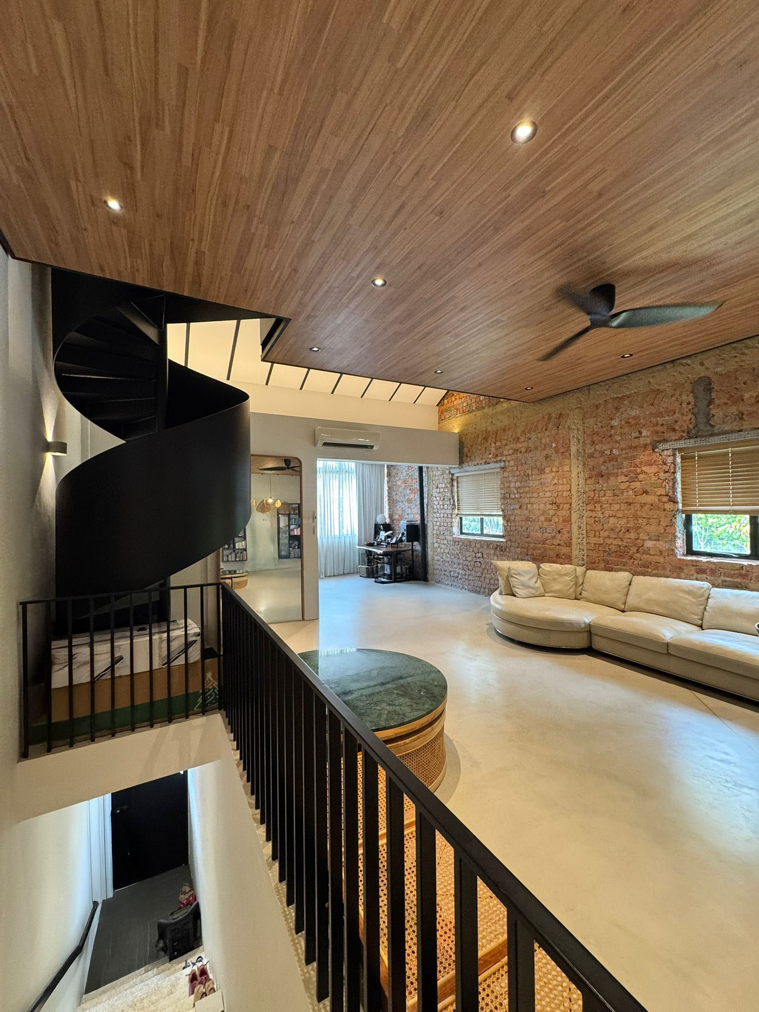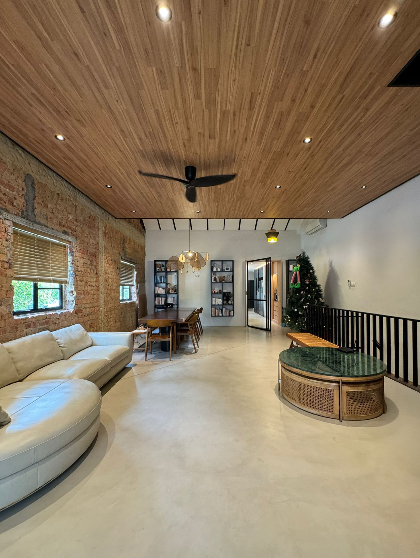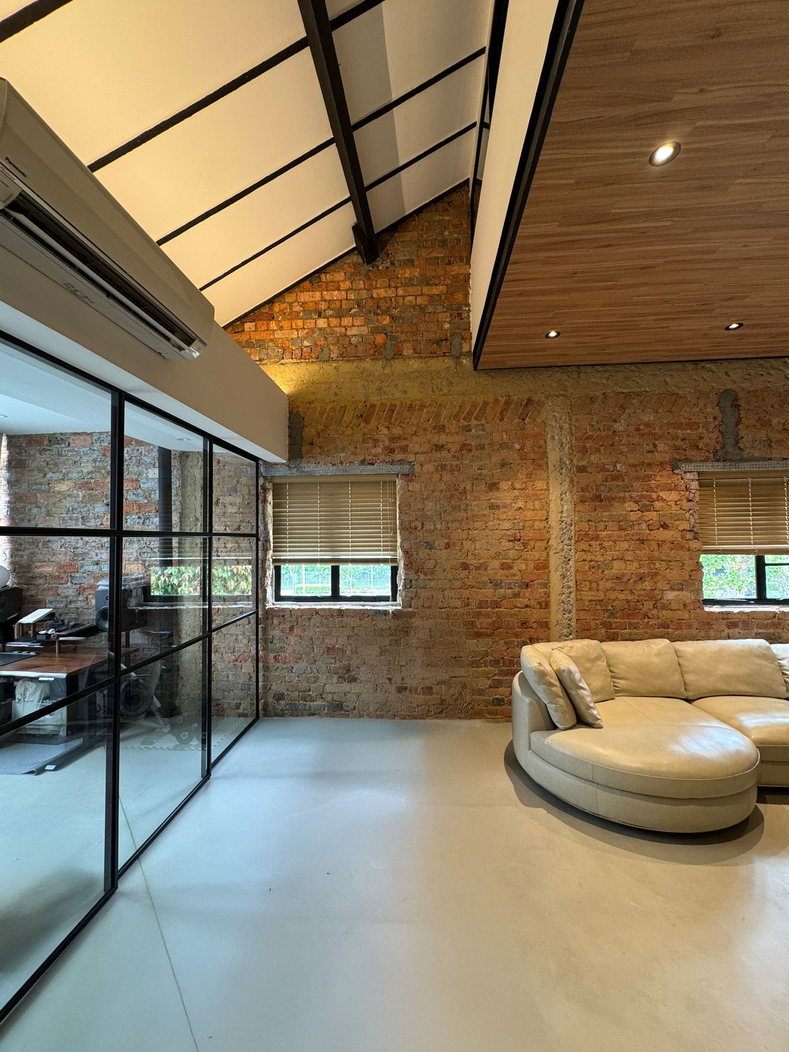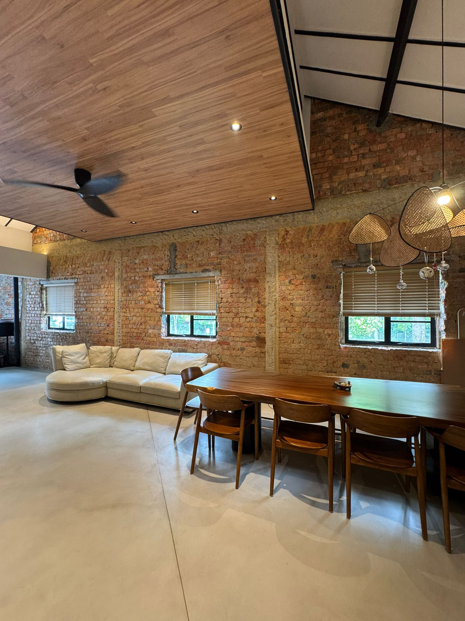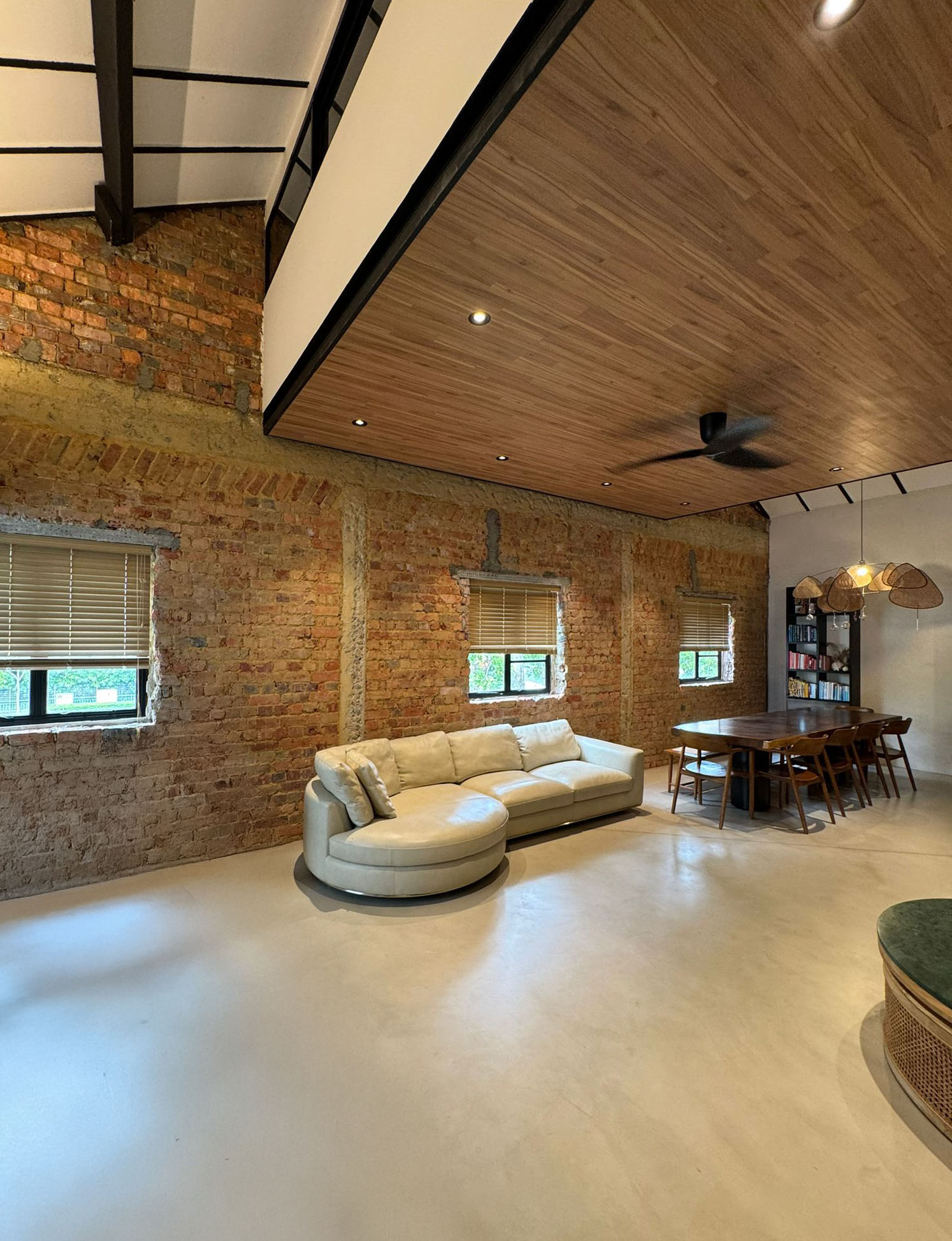 Spanning 1,500 sqft, the proportions are generous and thoughtfully planned. The double-volume living area is a real highlight, accentuated by high, pitched ceiling that allows the space to breathe. Natural light filters gently throughout the day, while the combination of wood tones and brick keeps the atmosphere warm.