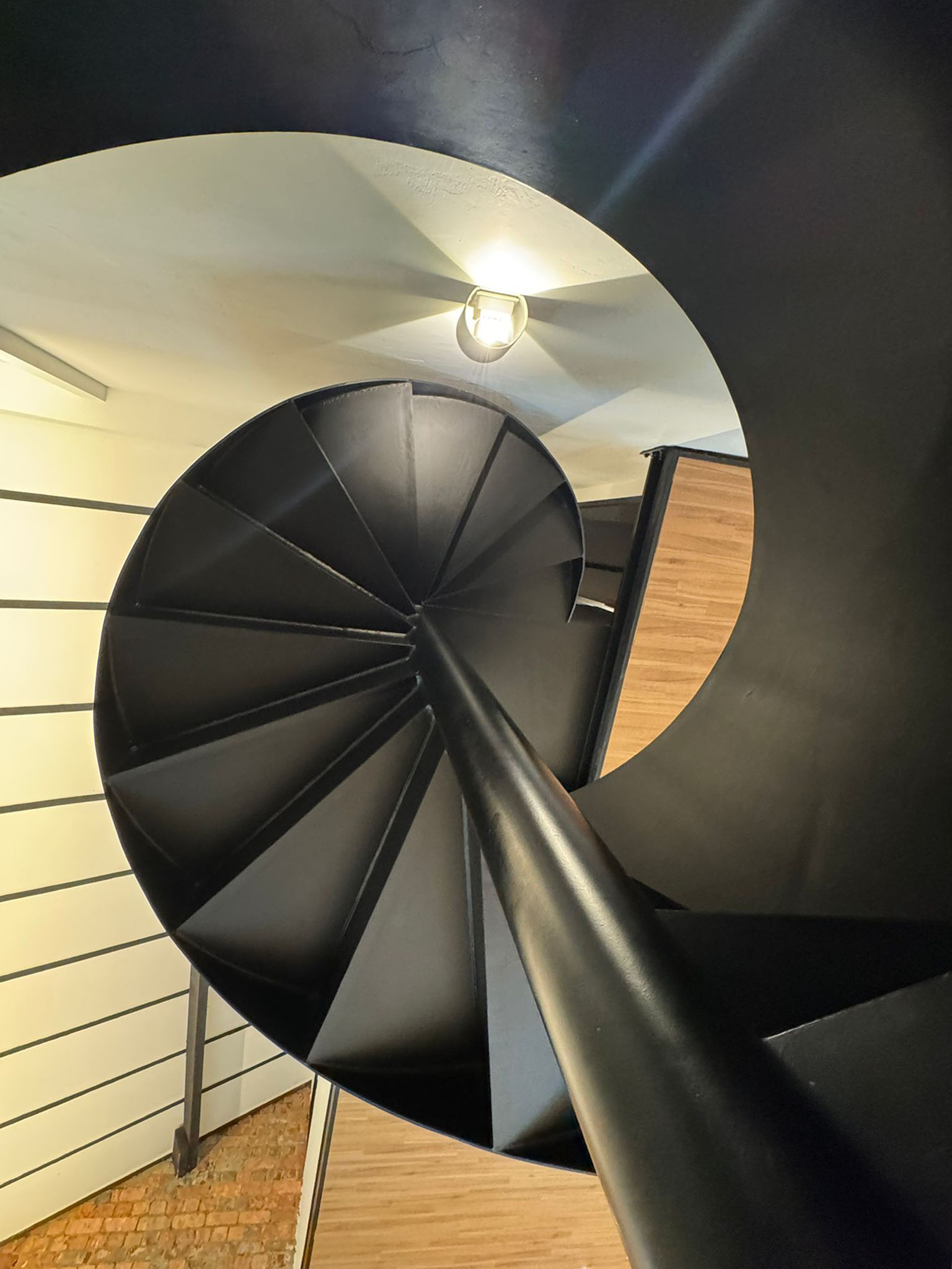A sculptural spiral staircase anchors the space and leads up to the loft, now used as the primary bedroom. Set beneath the pitched roof, this level feels intimate yet comfortably spacious.
