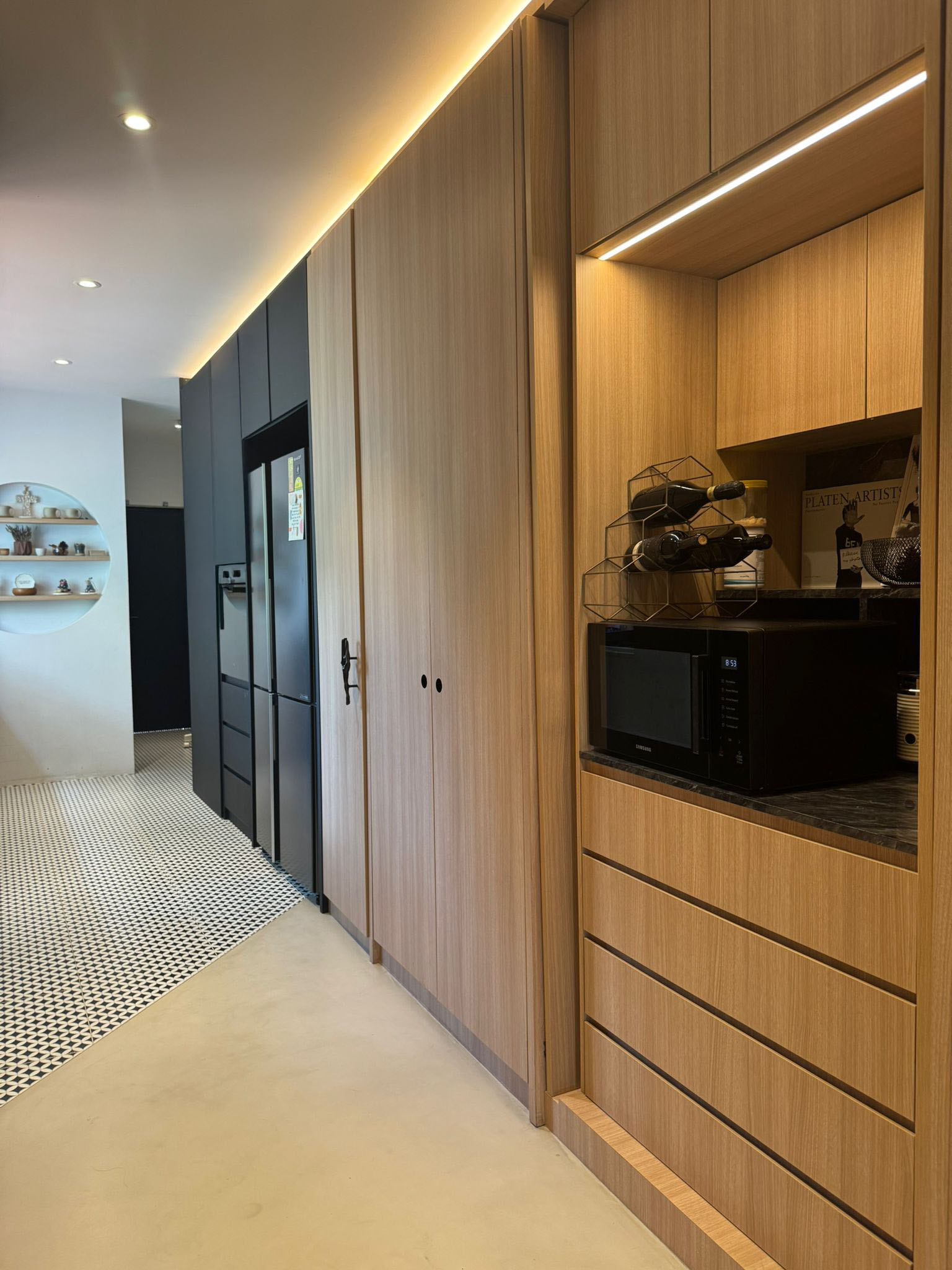 The kitchen is especially well thought out, balancing function with quiet style. A mix of oak and black cabinetry brings warmth and contrast, while black-and-white mosaic floor tiles add character. Storage is generous, with cleverly concealed pantry doors that keep everything tucked away and uncluttered.