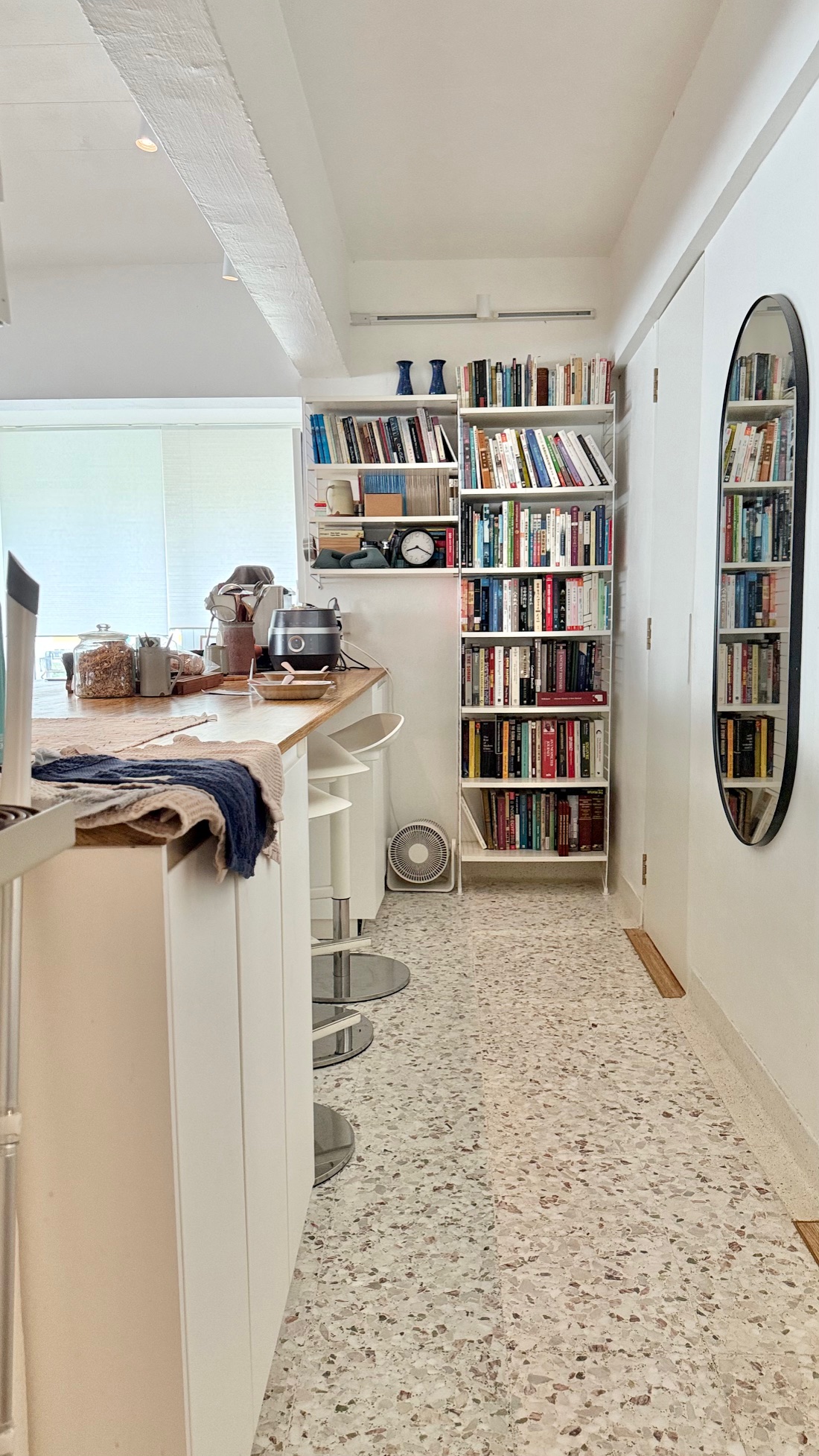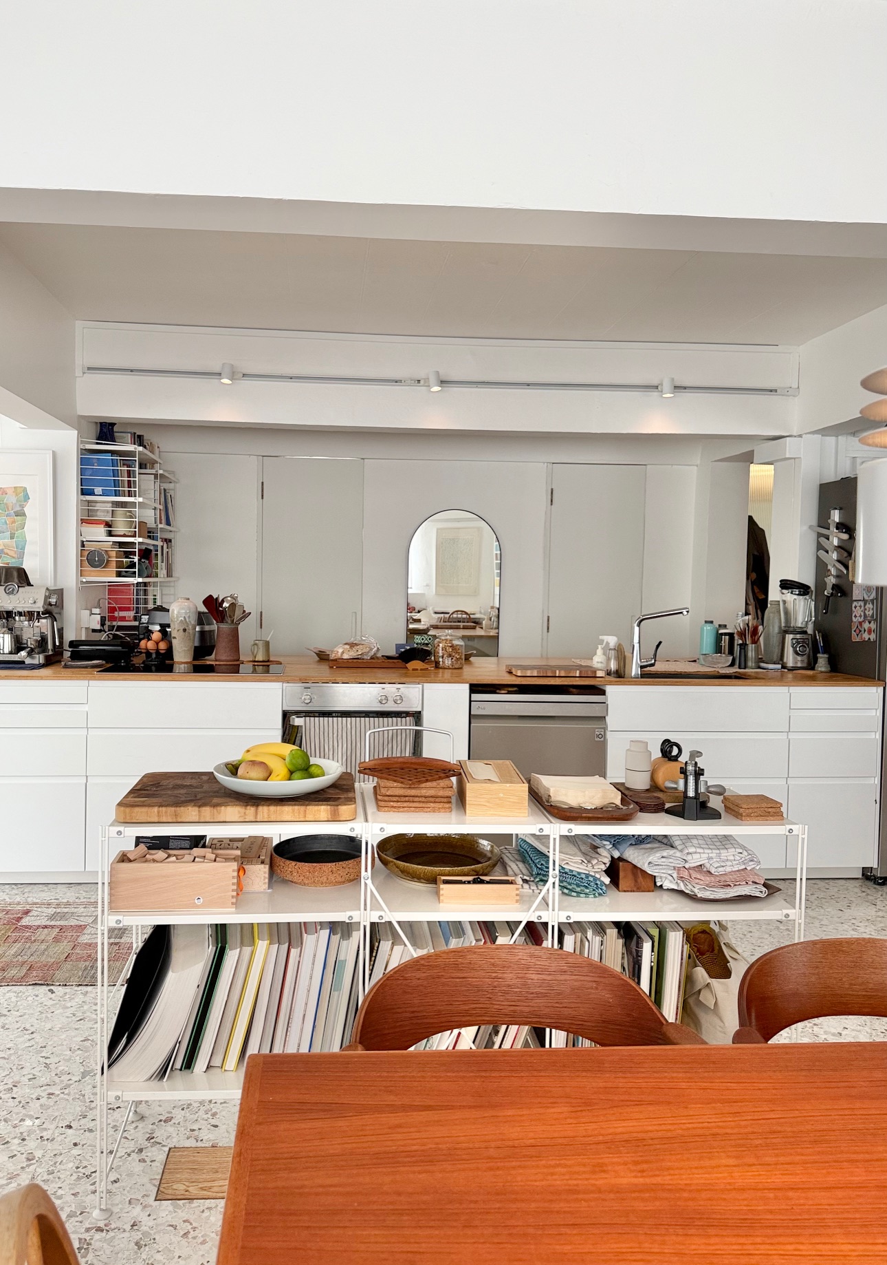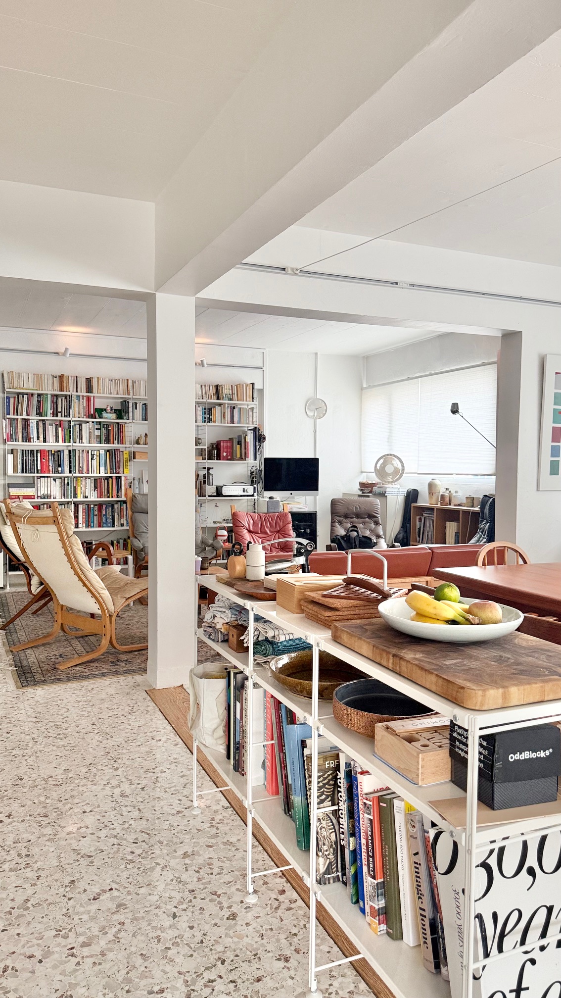 The layout opens gently from one area to another, with books lining the walls and everyday life visible in thoughtful details. A home for reading, thinking, cooking and sharing simple, precious moments. The long kitchen island connects people & holds all in place, it is where your day starts, from morning coffee to slow dinners, where the space is used and enjoyed.