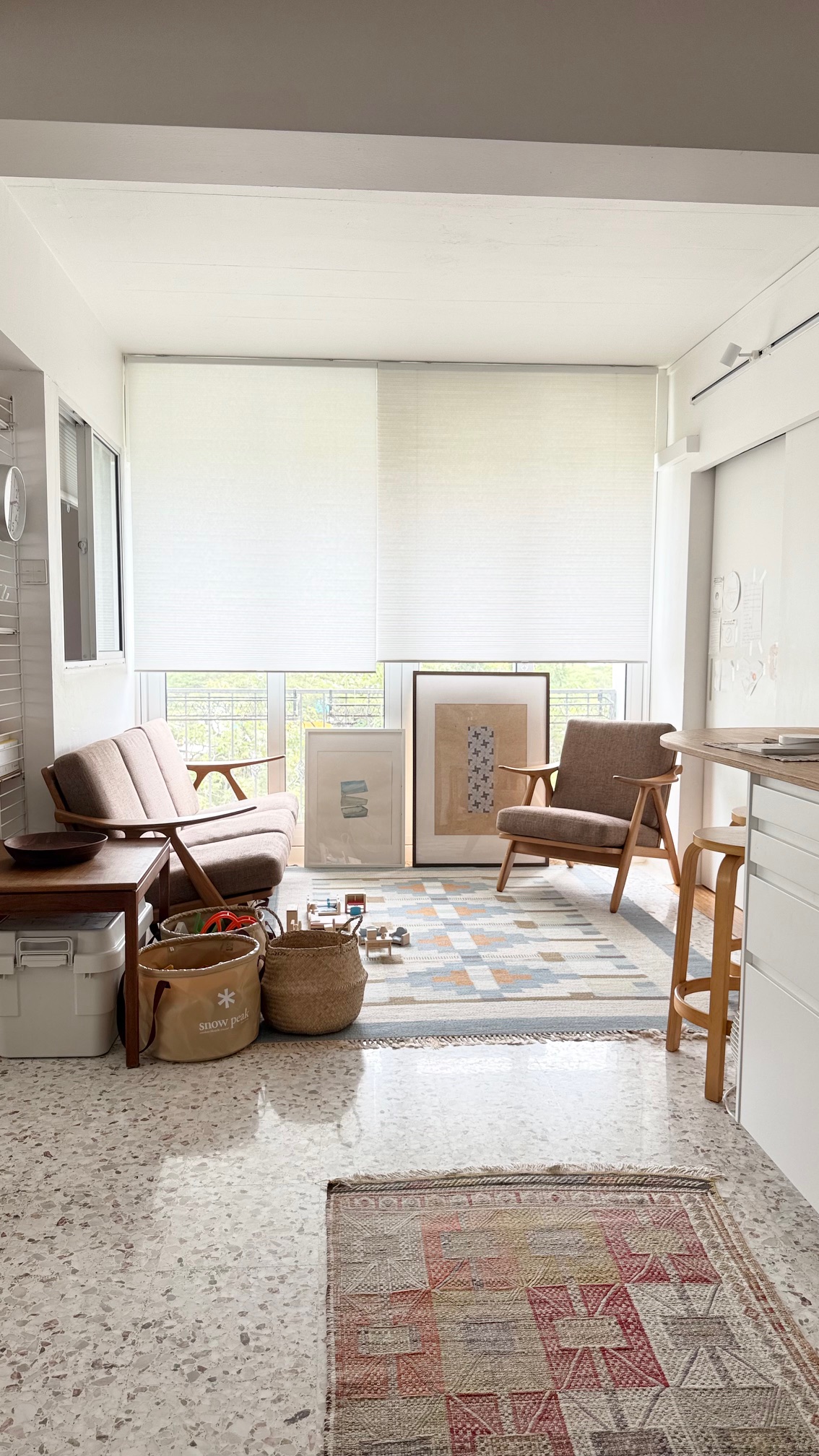 Terrazzo flooring runs throughout the home, enhances the seamless and cohesive aesthetic in this open plan home, evoking a whiff of nostalgia. The gentle and smooth texture underfoot, with timber floor pieces demarcating the dining space from rest of the home, adds comfort and warmth. The dining is the heart of the home, an extendable table accommodates a bigger party. In the living, it’s filled with the owners’ beloved lounge chairs which they were obtained during their treasure hunts in countries they have visited. Each piece tells a story and creates a memory for the owners. Meaningful and unpretentious. The space is organic, natural and easy, as though it has grown into itself.