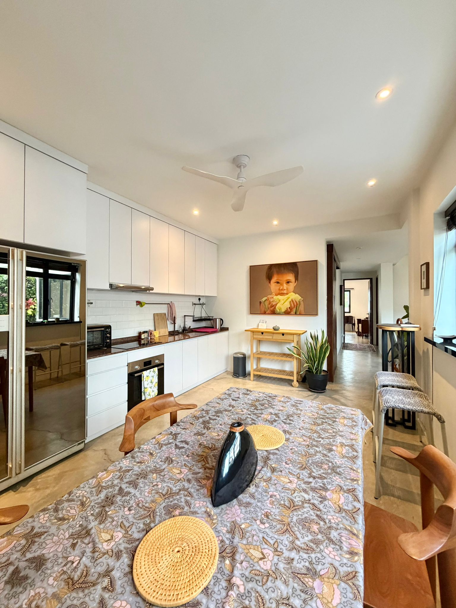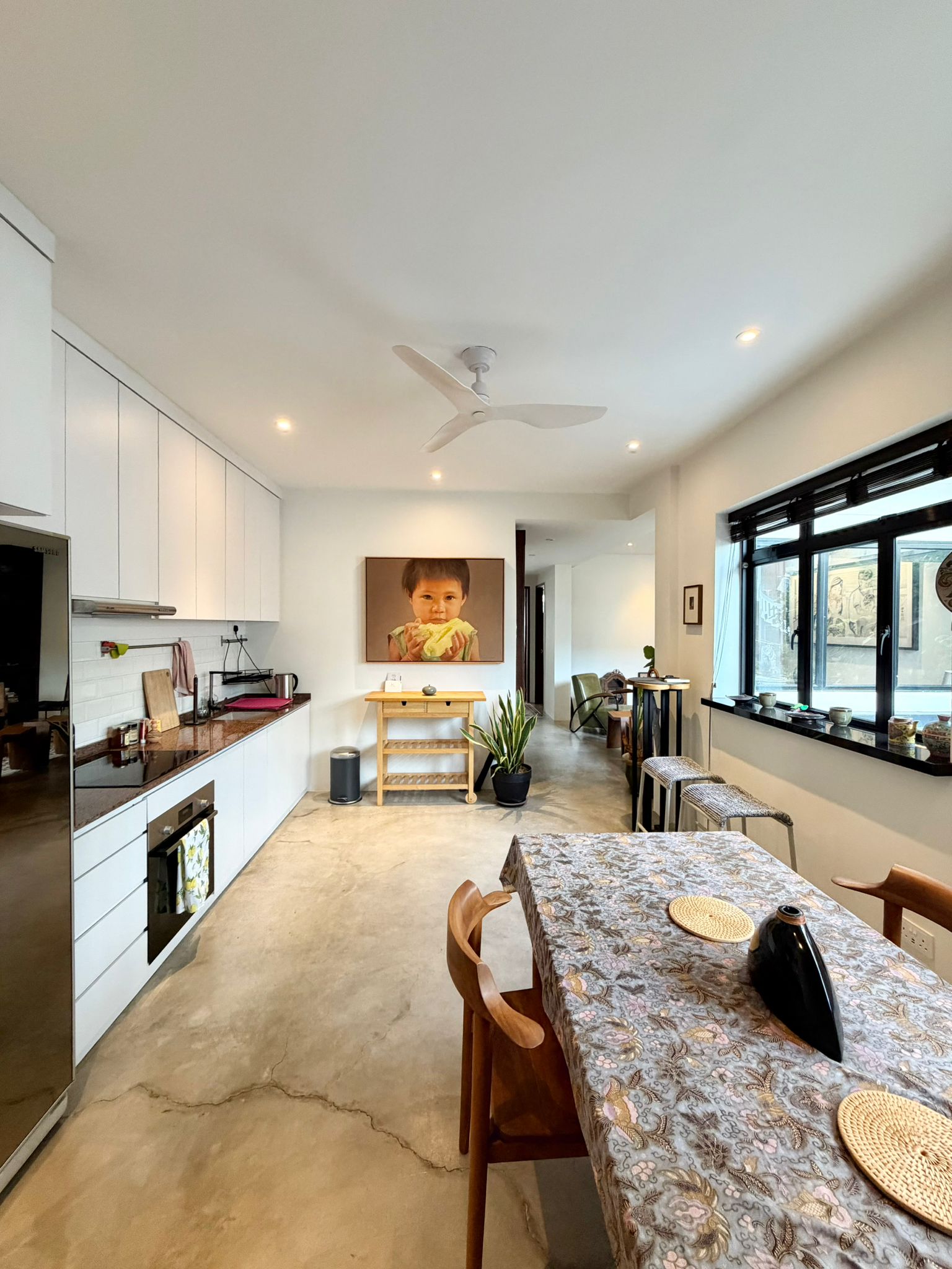 The kitchen runs clean and linear, finished in white cabinetry and complemented by a rich stone countertop. It sits comfortably alongside the dining area, making the entire space feel connected and intentional. Perfect for everyday living or casual hosting.
