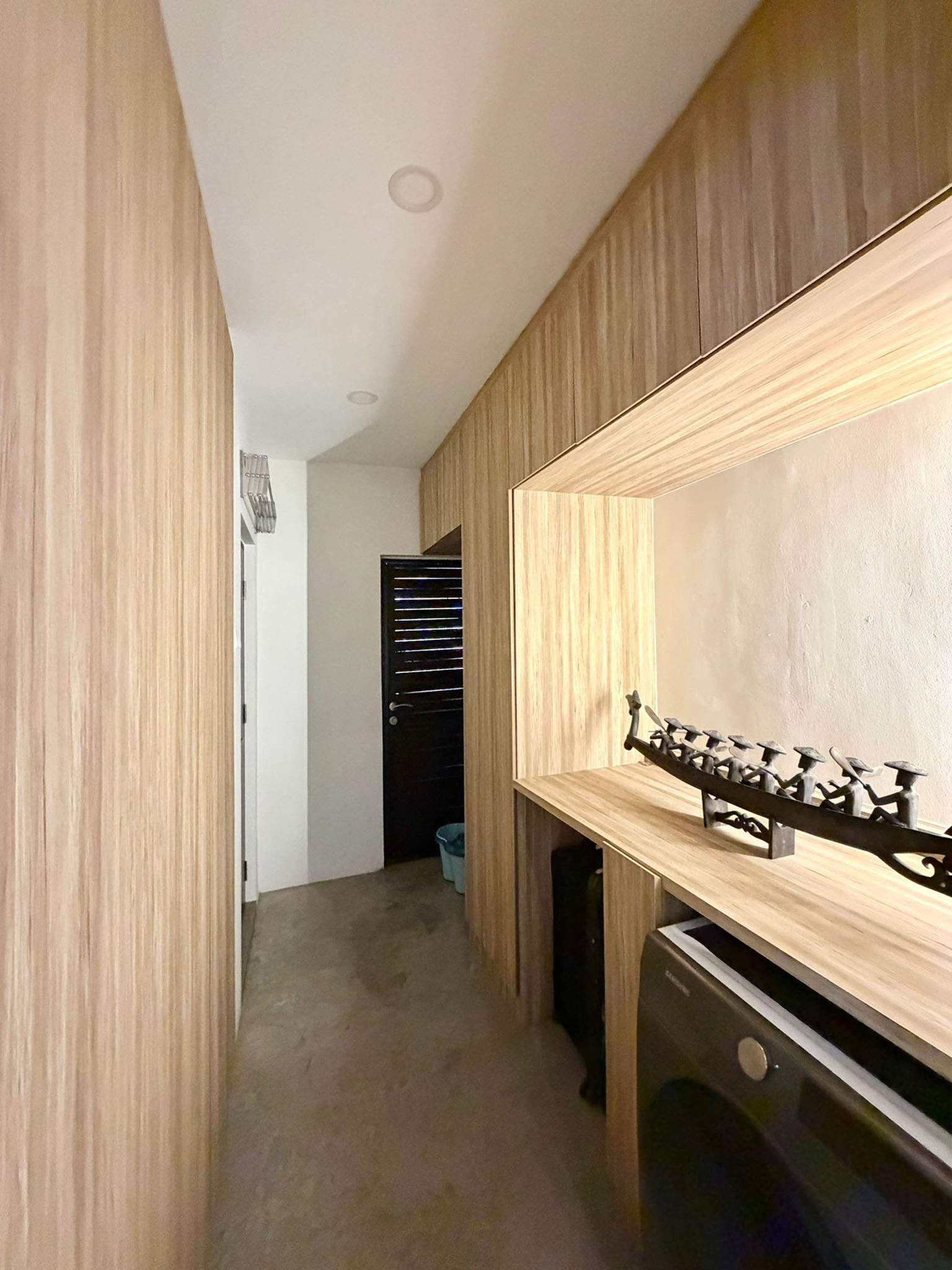 An inviting design palette stays consistent throughout the home. Wood tones add warmth, while the screeded floors and clean white walls keep the space feeling calm and grounded.